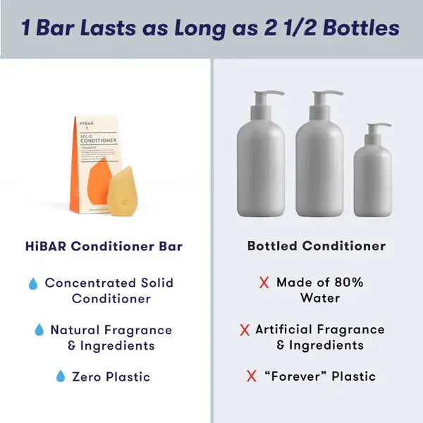 The unique shape of HiBAR Conditioner Bars is designed to fit comfortably in your hand for easy use. And don’t be fooled by the compact size—each conditioner bar lasts as long as 2 1/2 big plastic bottles of liquid conditioner.