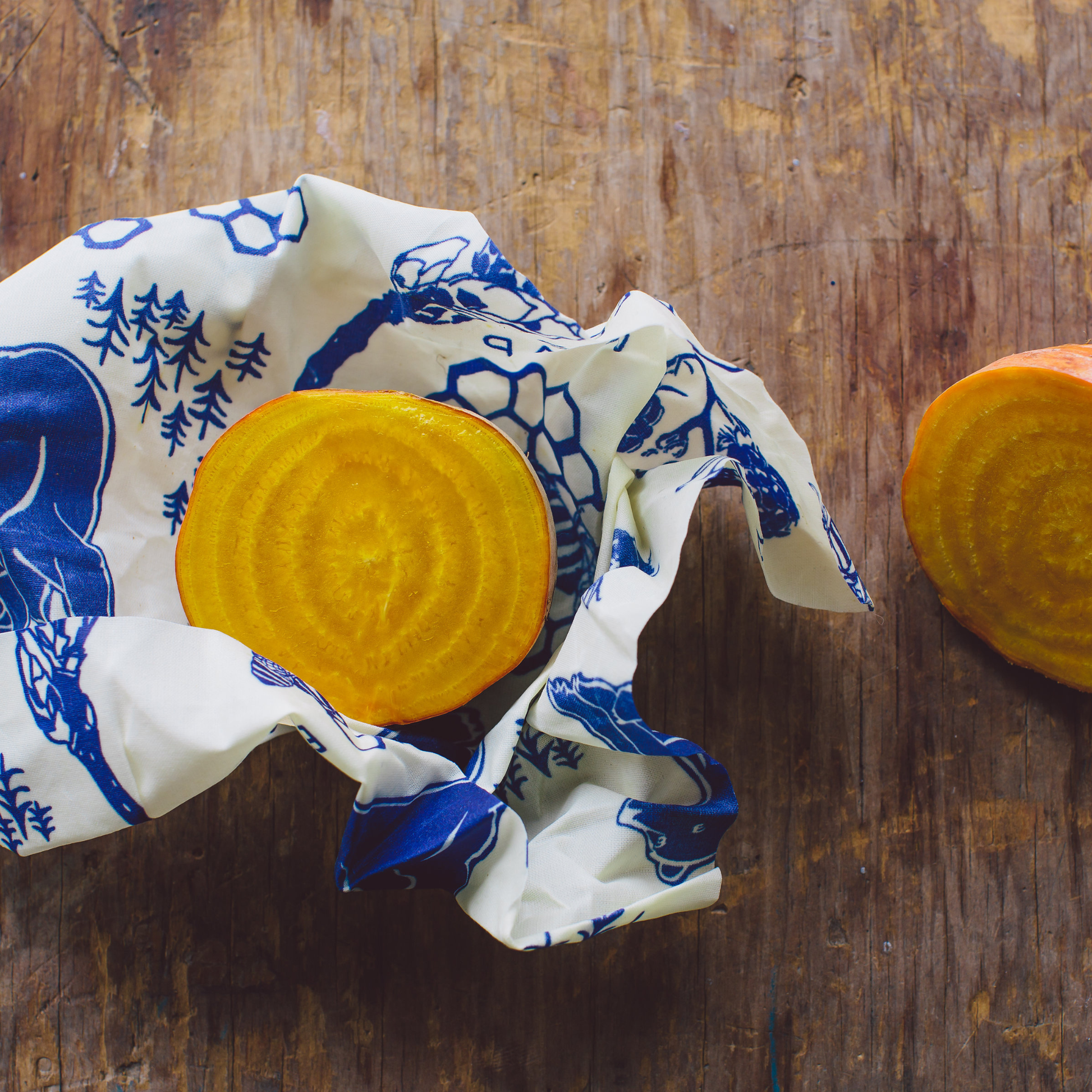 Our reusable fabric food storage wrap is made with Organic Cotton coated with beeswax, organic plant oils, and tree resin offering a flexible yet durable wrap that can be used again and again. Handmade in Vermont by a Certified B Corporation. Bee's Wrap® is washable, compostable, and reusable for up to a year. Wash in cool water with a mild soap and let air dry, avoid exposure to heat. Compostable at the end of its usability.